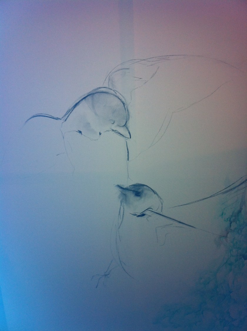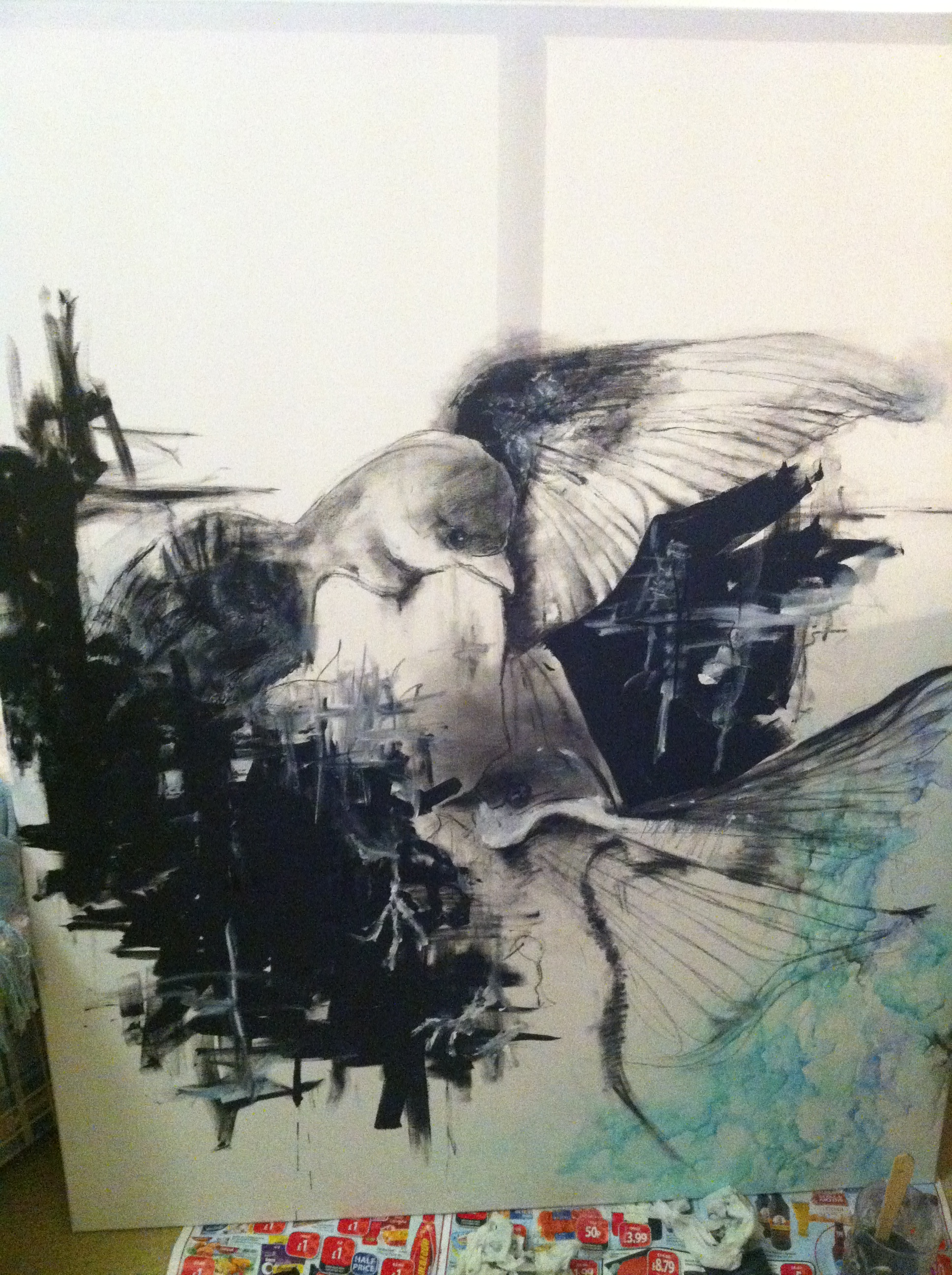 After finally getting re-equipped with some basic art materials as a result of my post-moving clear out, I have begun the sketch for my first large scale painting in quite a long time. I am not expecting to bang out any masterpieces, just merely blow away the cobwebs. Inspiration: mixed media, jumbled mess. Subject however, completely random…