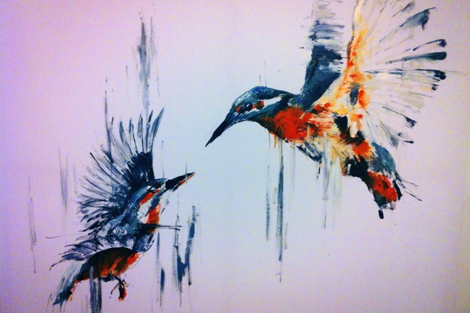 A recent painting of mine, two king fishers, one male and one female. 🙂