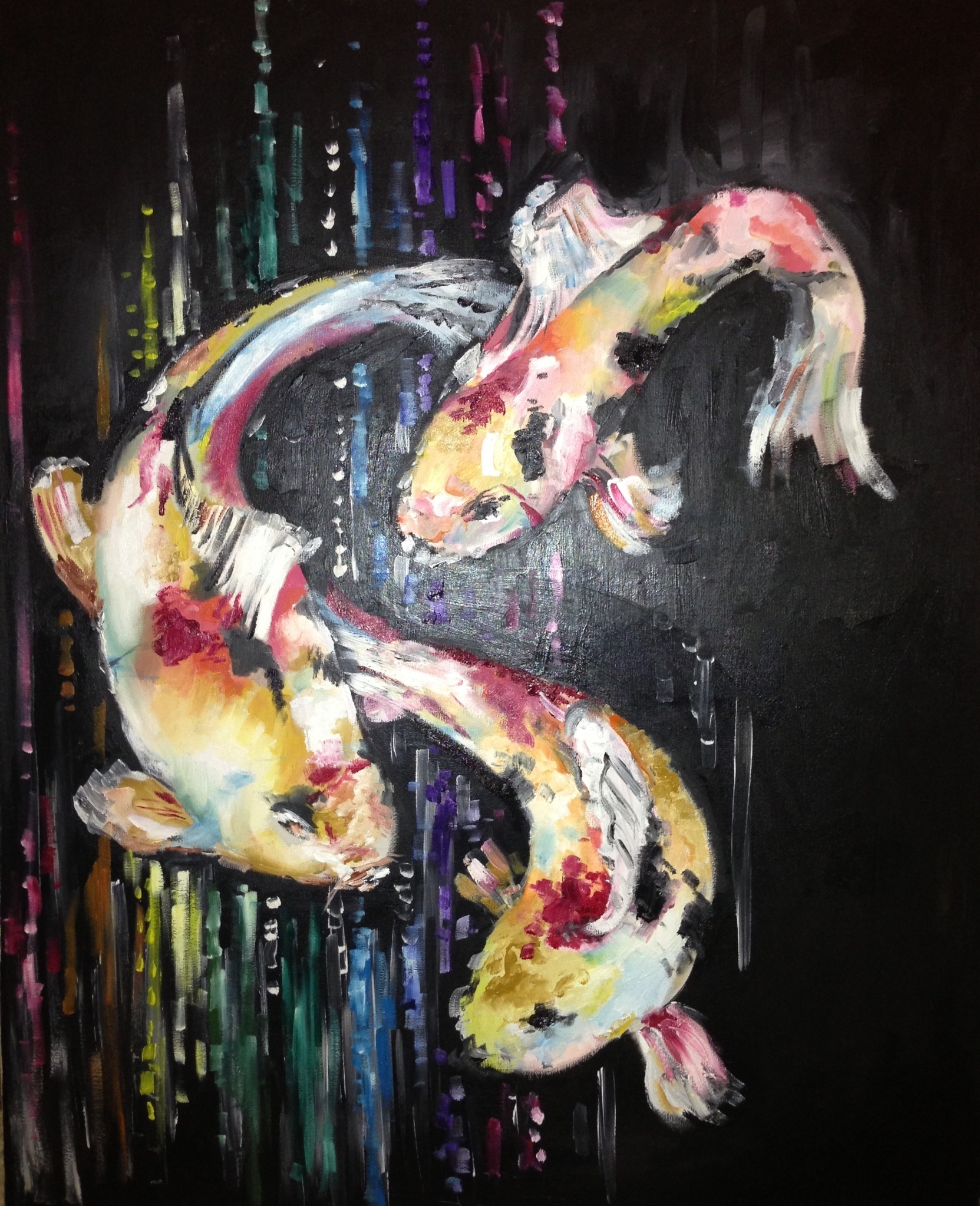I absolutely love this finished piece of three koi carp. It wasn’t an easy one to complete, I started this painting with an idea of a light background. After attempting to get a flattering spectrum of colours within the water glistens the colour just did not pop enough. A black background was suggested which made a huge different immediately. The colours were brought together and more framed and flattered, in keeping with the elegance of the movement of the fish.