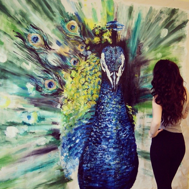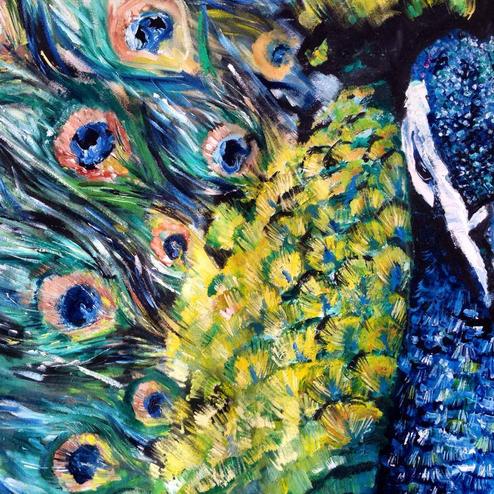 I was commissioned to create a peacock painting for an office space. Immediately I knew I was never going to waver on if I would take this project on or not. The symbolism behind peacocks played a large part for the company and its meaning was something that resonated with myself very clearly and personally. The imagery of a peacock in my eyes is one of the most spectacular natural wonders, a peacock feather alone fascinates me. The colours have always been my favourite palette and the elegance is just very ‘me’…