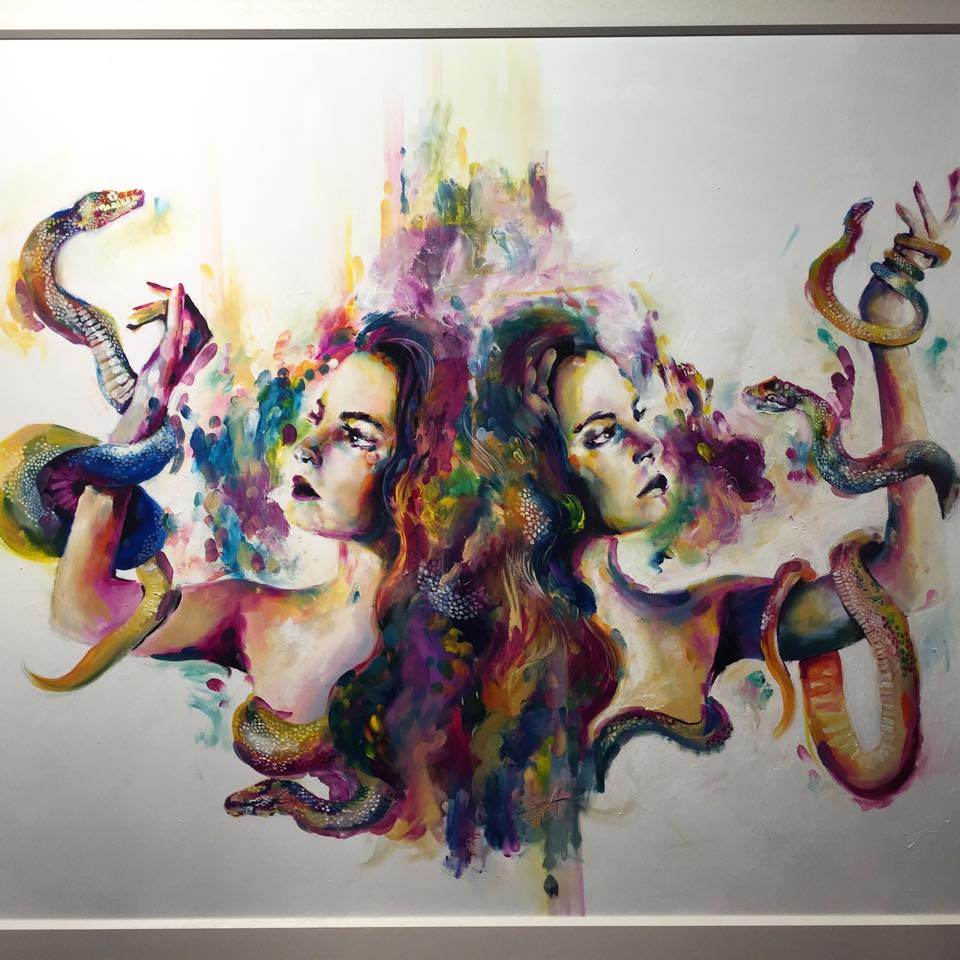 My exact reason for clicking my purchase straight over to the checkout was because it reminded me of a painting I did in my last collection (The Phosphenes Collection) which depicted a bizarre image of two symmetrical women holding up snakes, which are coiled deliberately around their arms within the confines of the symmetrical intension. (Original piece shown below / ‘Serpens’ oil on wood panel)