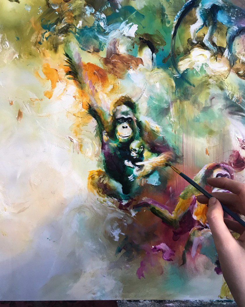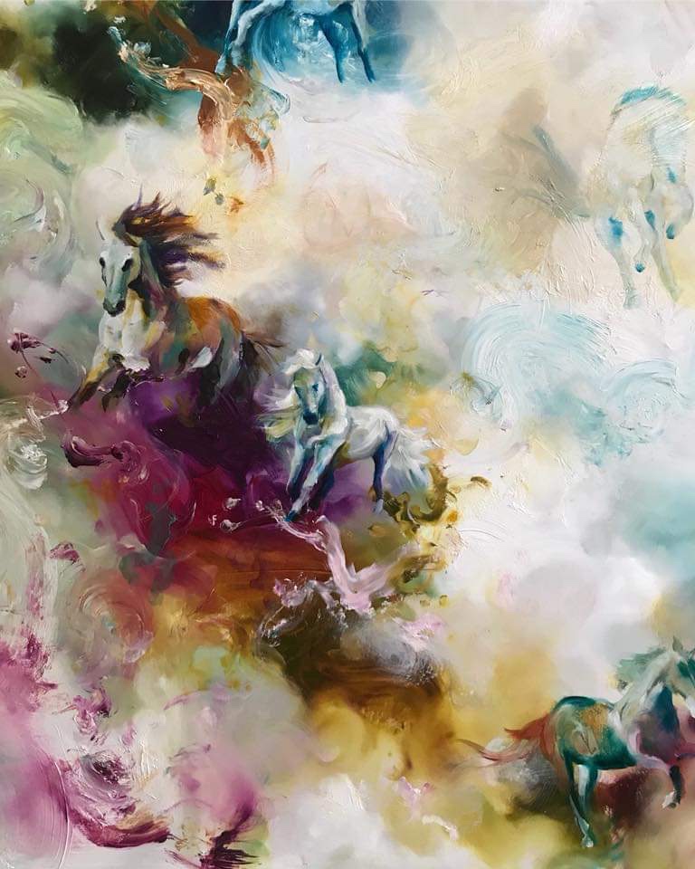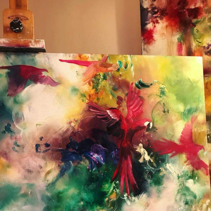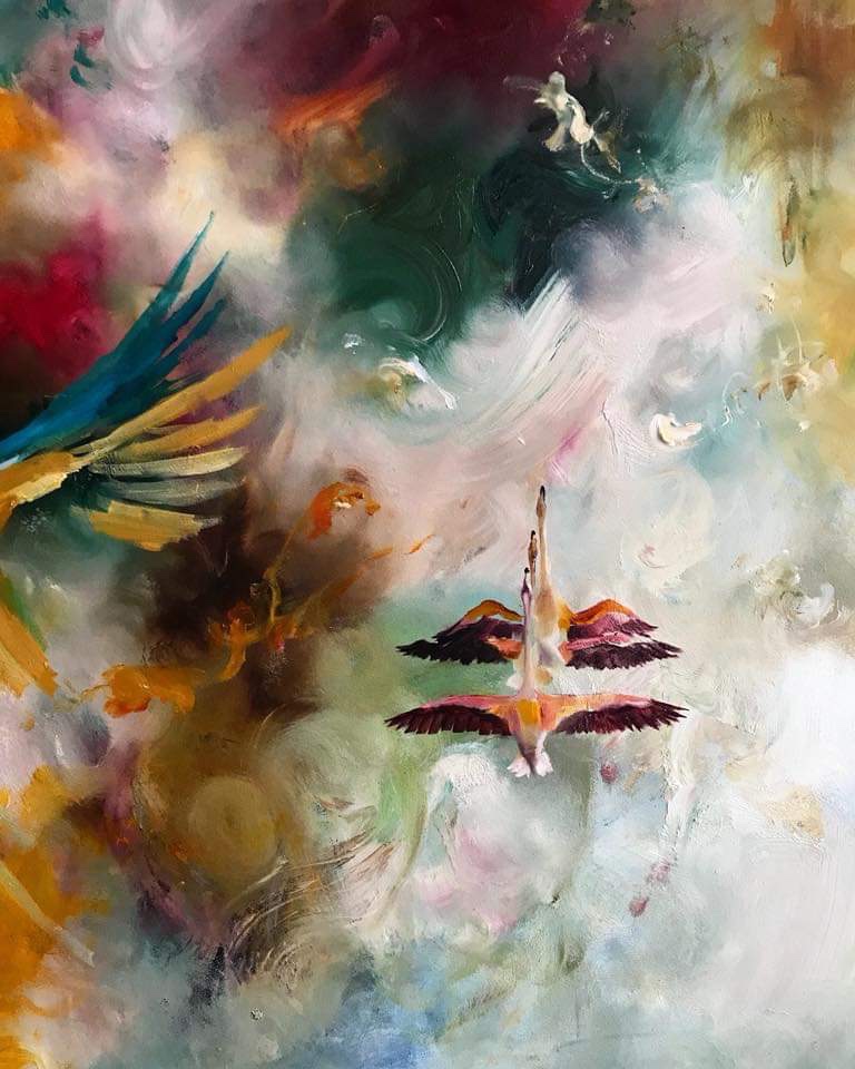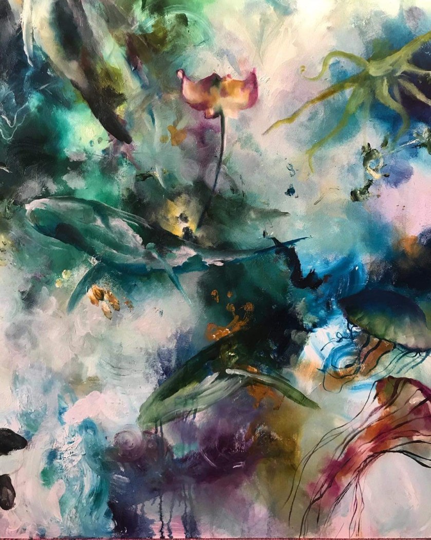 This collection has been something different that has taken over. It has begun as more of a celebration for the pigments and colours that I use and the way that I use them. I changed my way of application, as well as my usual process in order to take an in depth look at my colours and how to really showcase them. In starting the collection it was hard to know if I could achieve the aesthetic I had fixated on in my mind. However part way through the paintings seemed to create themselves. I have let my more logical side take a back step initially, and let the foundations of the work be born from an instinctive and fun way of applying my materials. I have waited for the subjects to show up, and allowed them to immerse themselves into my abstractions. The collection is still a work in progress, but here are some close ups of sections of the many, many pieces of various subject matter that make up this body of work.